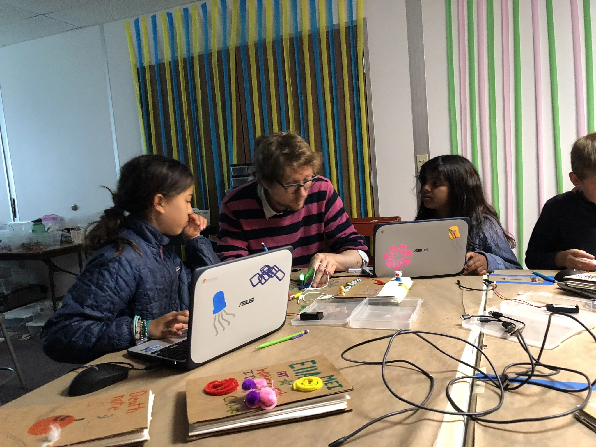 The summer camp is giving our team of educators the chance to prototype ways of introducing computational tinkering activities. Its been great to try to develop new strategies for lowering the threshold for these experiences while still giving learners the chance to get an idea of the elements needed to develop projects with wide walls.