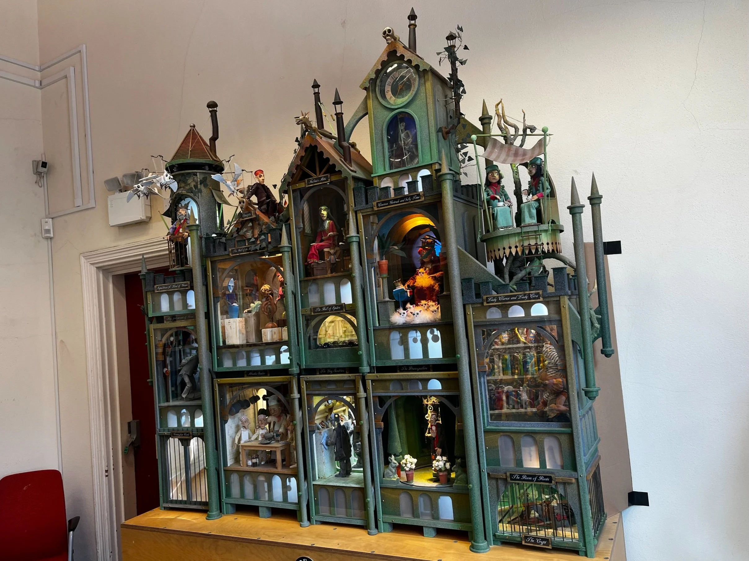 Downstairs from the art gallery, we entered the children’s section of the Falmouth Library where we encountered an amazing giant automata made by Keith Newstead. This masterpiece is a adaptation of a series of novels called the Gormengast Trilogy (now on my to read list) and depicts many scenes from the book. Incredible work from one of my favorite automata artists.