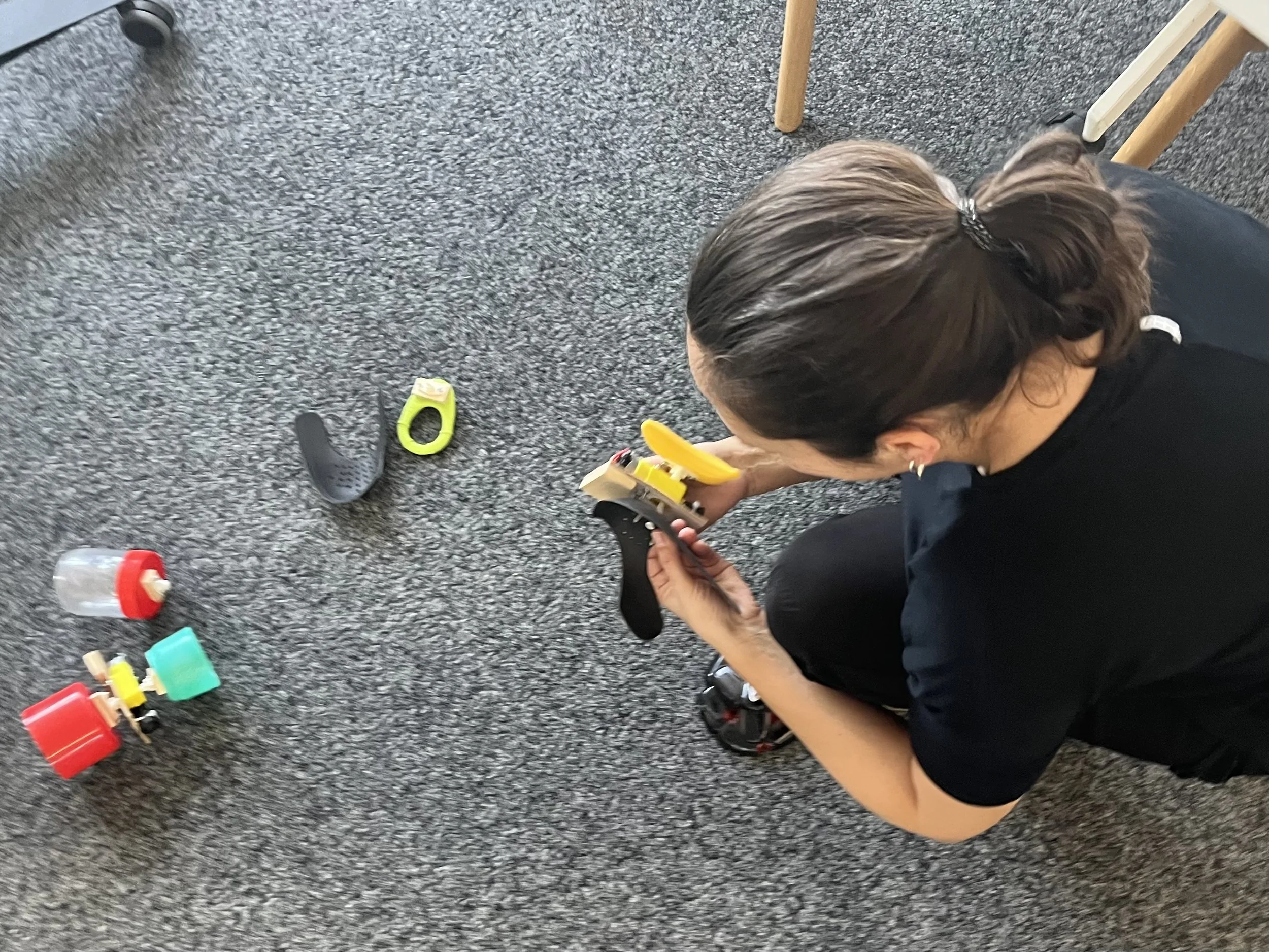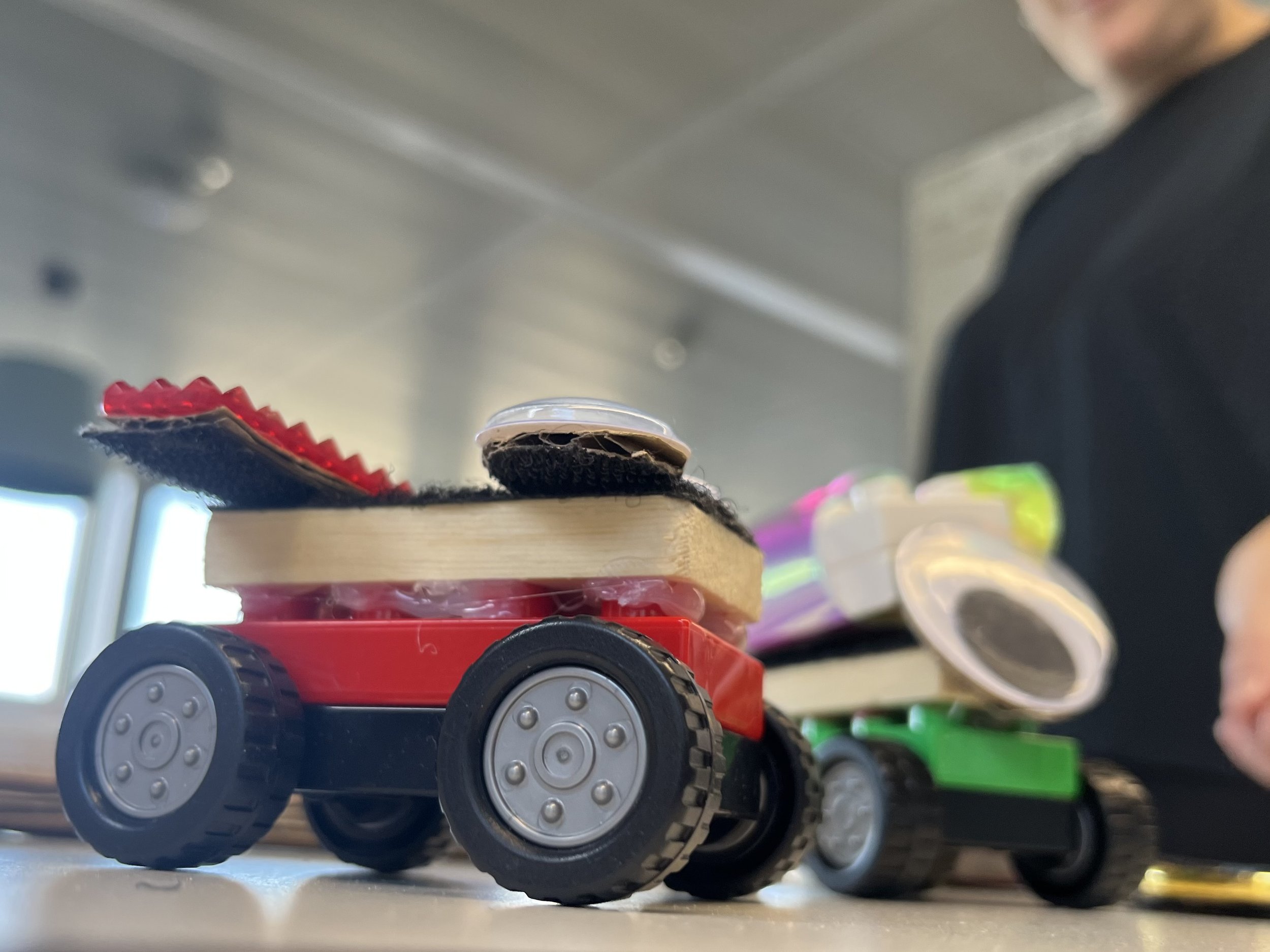And finally I shared a project that has been really popular with my three year old, combining duplo cars with velcro pieces so we can add everyday materials to the construction set. I like this mash-up because the collection of objects can be used both as decoration but also as ways to experiment with weight and shape to iterate on the functionality of the cars. We used a piece of thick honeycomb cardboard as the ramp but it’s also fun to play with curved tracks or jumps.