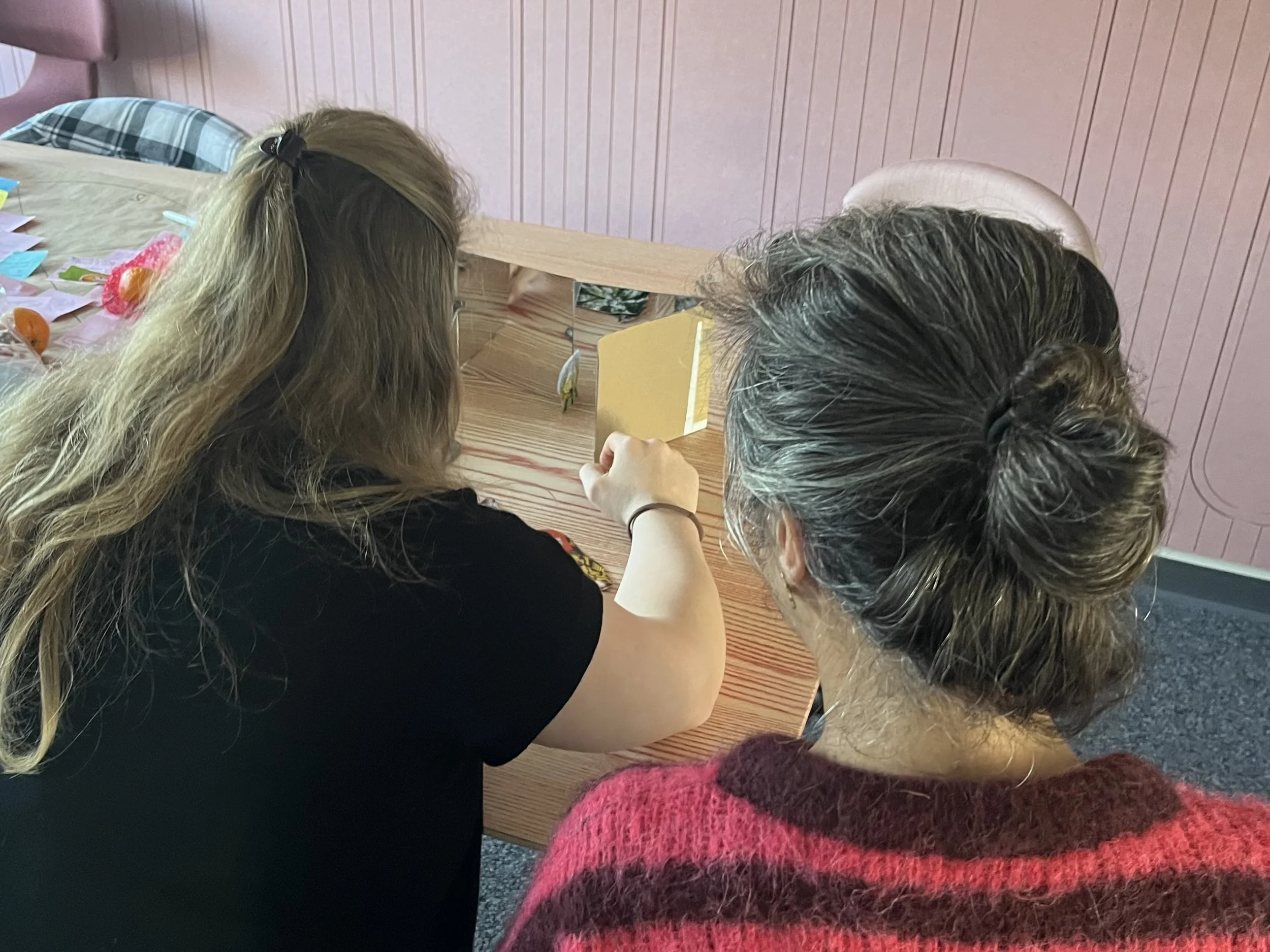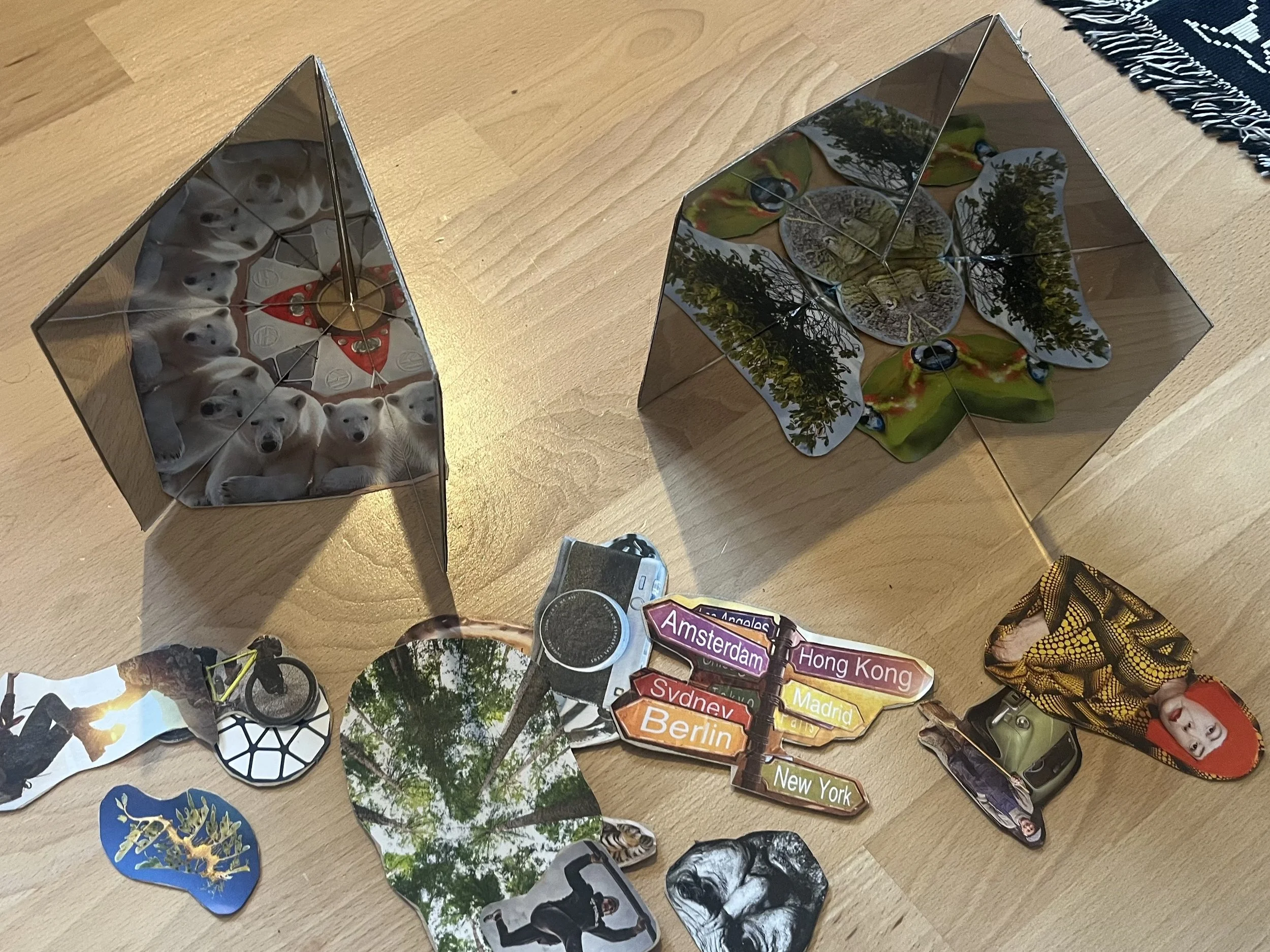 The next prototype that I shared combined cardboard collage (evocative magazine images mounted on thin cardboard) with angled mirrors. We’ve done many experiments with these simple hinged mirror setups and I think it’s a great way to start exploring light and reflection. I imagine that with the right collage materials we could explore storytelling character and narrative with young tinkerers.