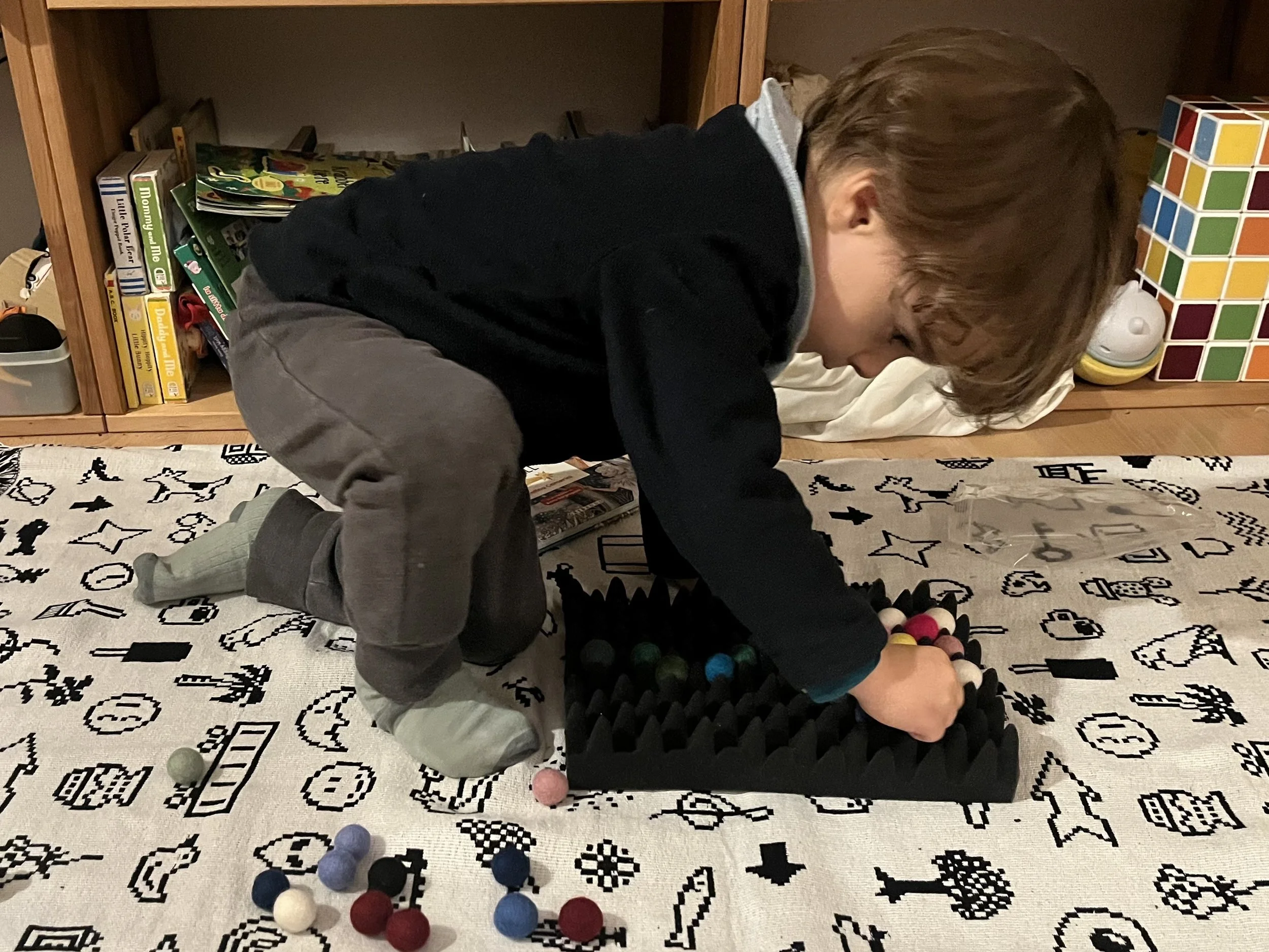 The first activity combined acoustic foam and small colorful felted balls. I love the simplicity of this set and how it can be used almost as analog LITE BRITE. It would be really interesting to experiment with different sized pieces of foam and alternative arrangements (on the wall or under a table). This activity really speaks to the tinkering quality of using familiar materials in unfamiliar ways.