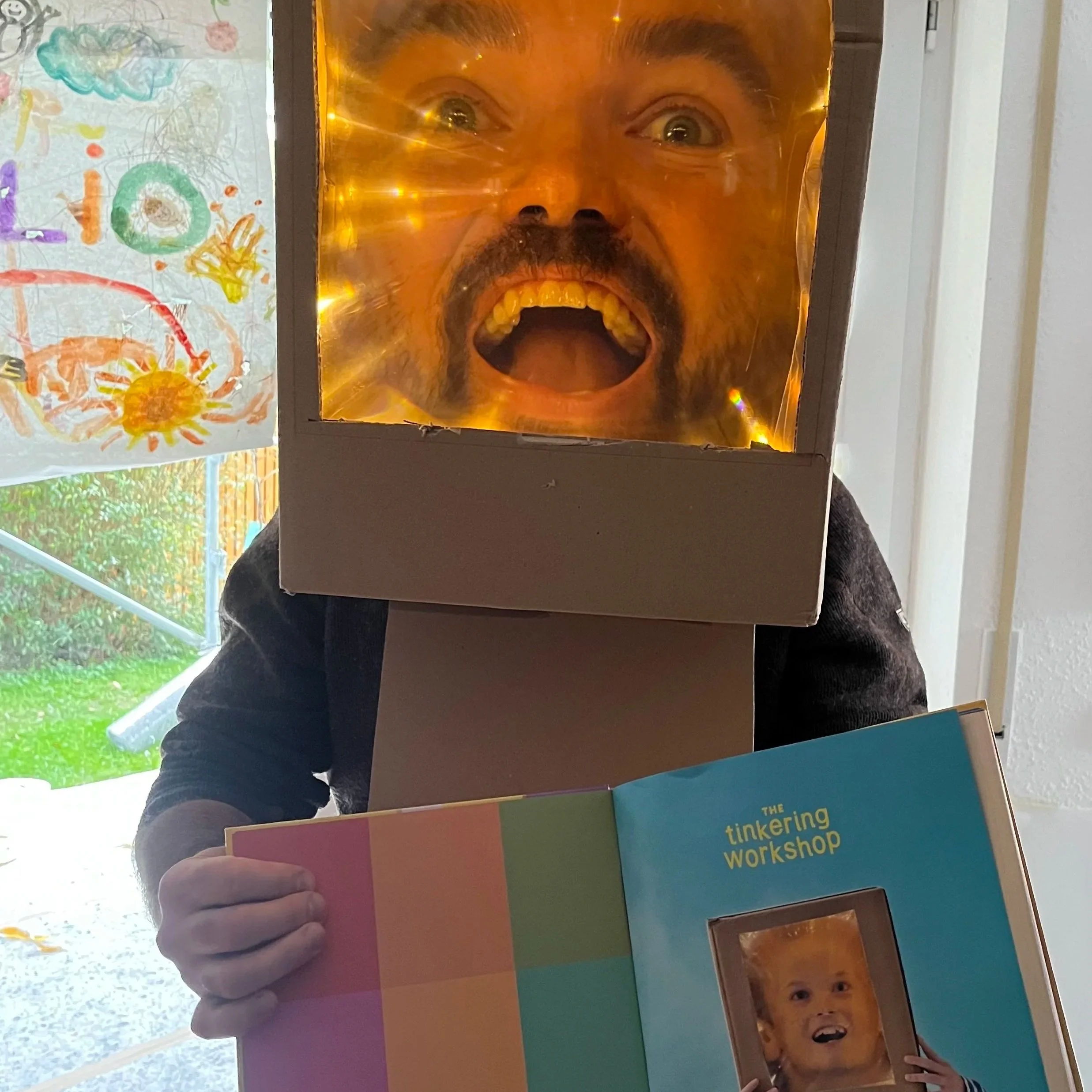 First off, I took some inspiration from my book, The Tinkering Workshop and featured artist Yuji Hayashi, by making a ‘Big Face Box’ for a halloween costume. This easy DIY project just uses a string a fairy lights, a plastic Fresnel lens and a big cardboard box.