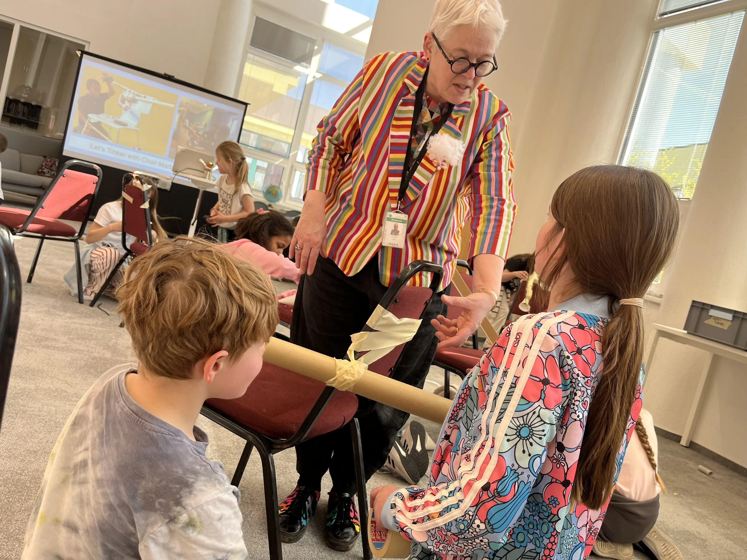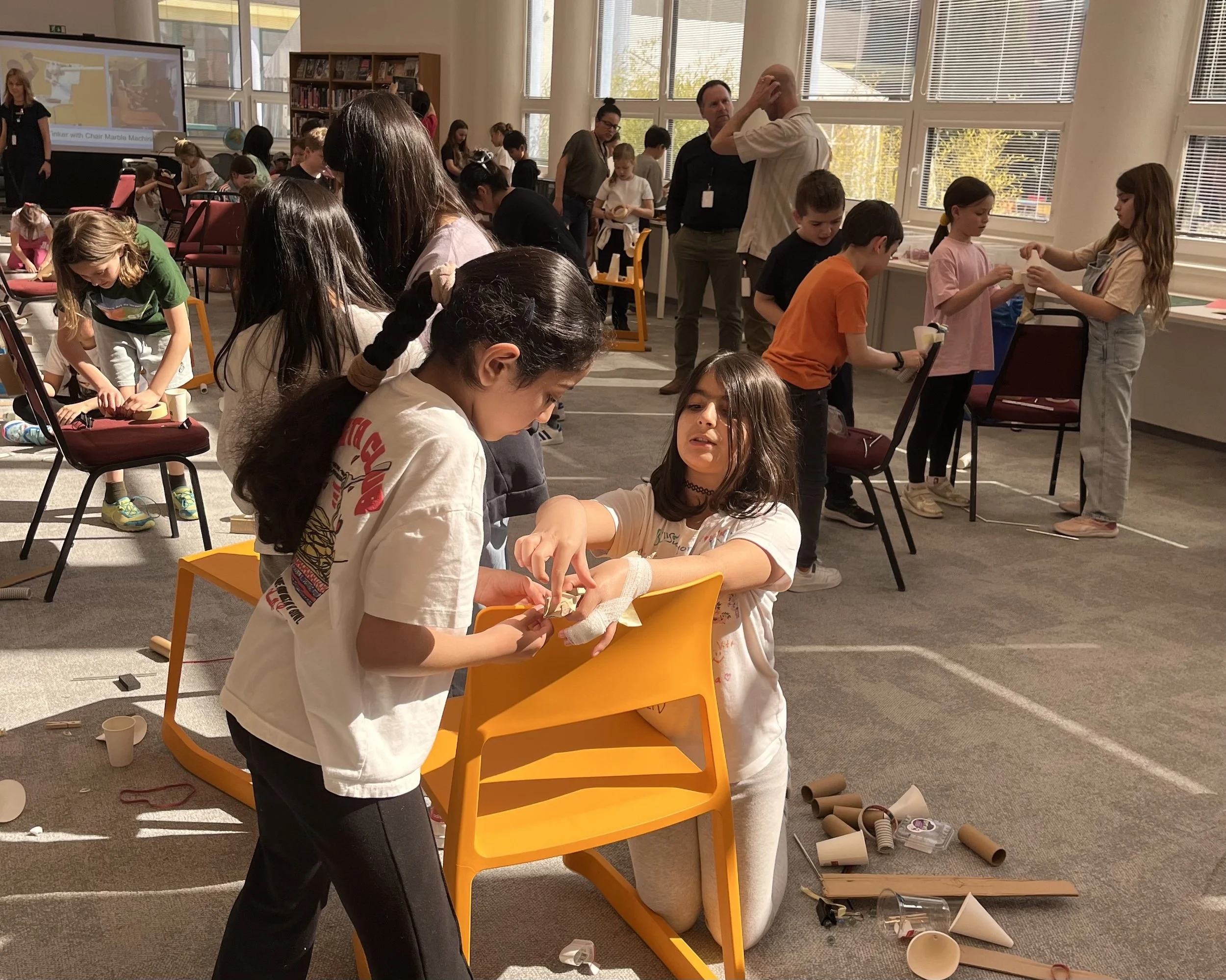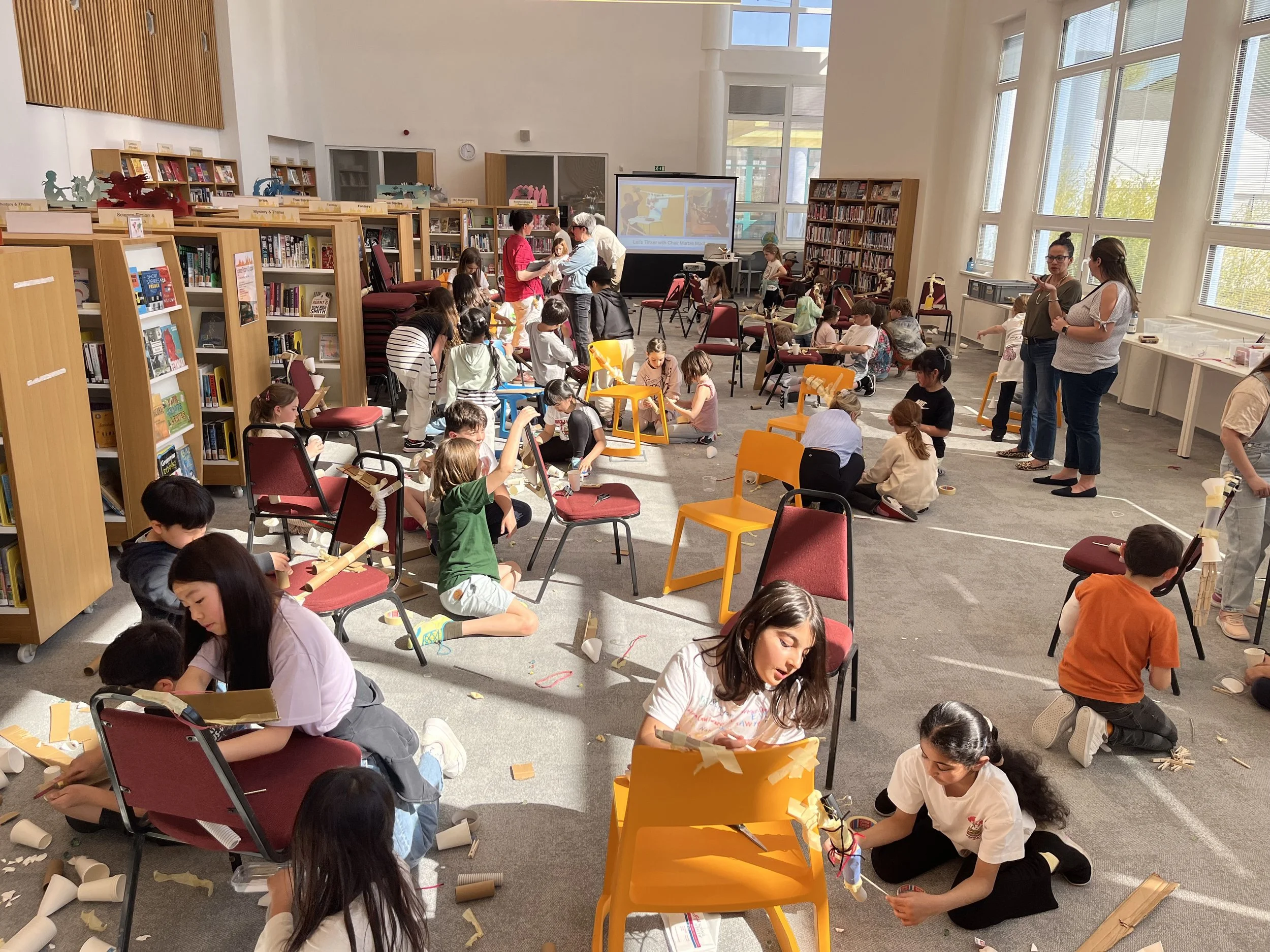 In one of the most exciting elements of the residency, we set up a chair marble machine workshop for the entire third grade class (about 70 students) in the school library. The team put together a bunch of building materials like tubes, long strips of cardboard, paper cups, funnels and recycled containers. Luckily all of the shelves in the space were on sturdy castors so they could be easily moved in and out which gave us a big space in the middle of the room. We had about 35 of some pretty standard fabric covered chairs where the groups could work in pairs on their projects.