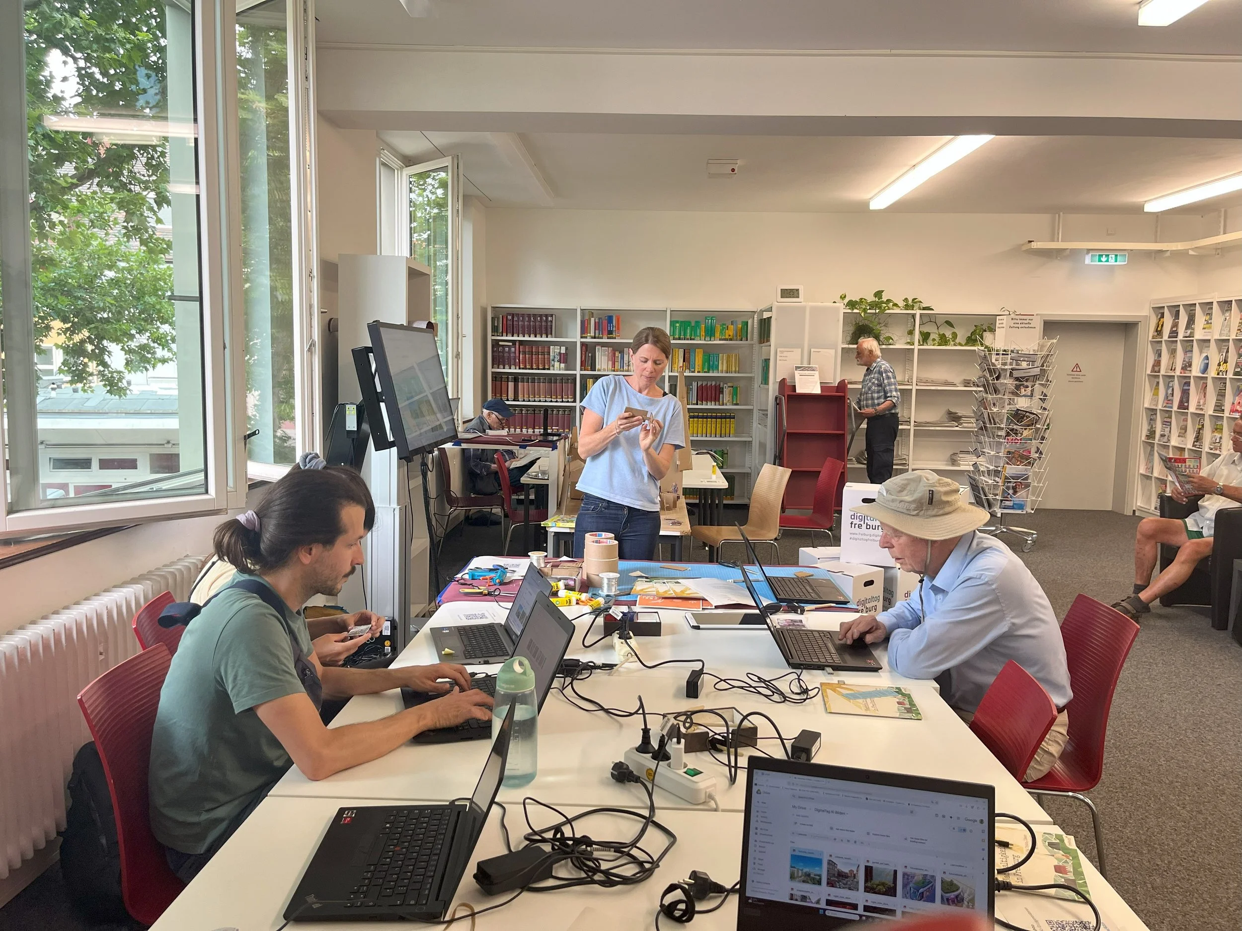 Last week as part of a nationwide celebration of digital tools and technologies in learning environments, I ran a experimental workshop at the Stadtbibliothek (city library) in partnership with the city sustainability office. The idea for the workshop was to use an AI image generator (we tried out SchulKI for the activity) to create pictures of a eco-friendly future for Freiburg, print out mini stickers and then add the ideas to a giant cardboard installation.