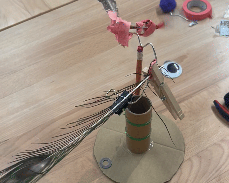For this workshop we started with about fifteen minutes of explorations with just wire and weights to build balancing sculptures before adding in motors. I’m still a little unsure about how to approach the idea that the weight should be below the balance point to make the object stay in place. On one hand I really like how that’s something that people can discover but on the other hand I’m worried that it feels too much like a “secret” that I’m consciously holding back from participants. It’s really important to have that concept in mind when making the more complicated motorized sculptures and I hope through examples and a pause for discussion I would like to draw that out naturally.
