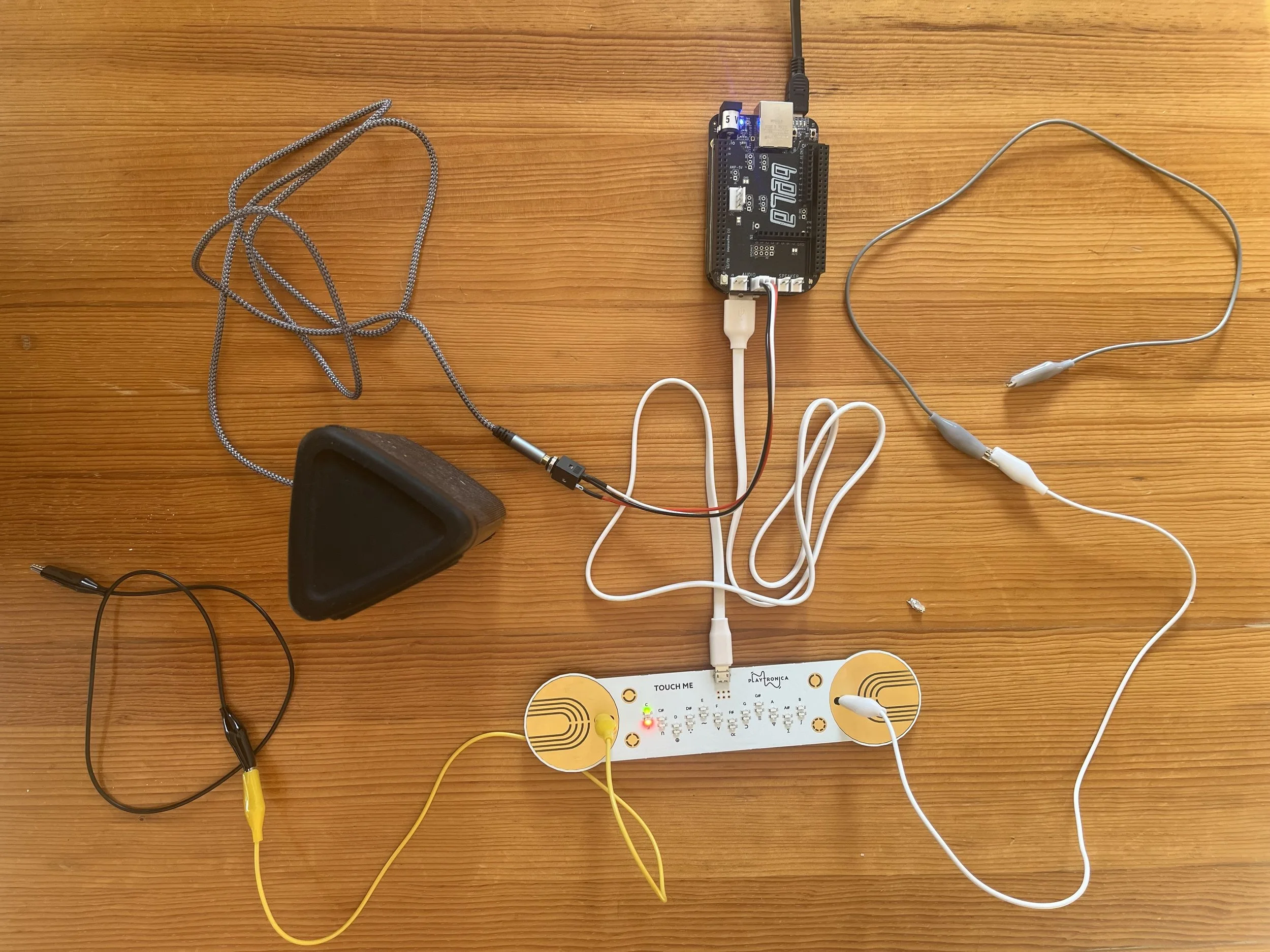 In 2019 I had the chance to create a new version of the bench for OliOli children’s museum in Dubai. The sound from the arduino board never felt completely satisfying for my so I took the opportunity to try out using a Bela Board for the sound processing and the Playtronica TOUCHME board (inspired by the original exhibit) for converting the electrical connection to midi notes. This combination of digital devices allows for more full and beautiful musical outputs closer to the original sound. Shortly after the visit to OliOli, the pandemic hit and somehow it’s been six years since that installation and I never got around to making a guide for this new iteration of the bench. Last week I was in Dubai and coincidentally the exhibit needed repairs so I thought that it could be a good moment to revisit and revamp the design. Here’s a quick start guide if you want to explore creating a similar version of the musical bench exhibit.