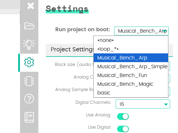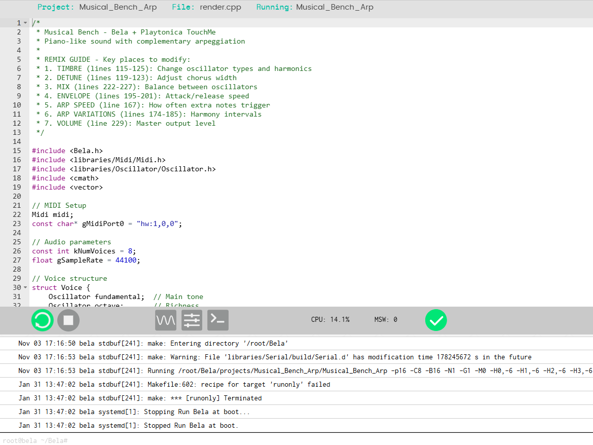To upload the code, you can connect the Bela board to your computer and upload the code to the board using the local I/O. Start a new project, opy and paste the code into the space and press the green run button. You can also go to the settings tab and have the program ‘run on start’ so that when the board is powered up the code will run automatically.