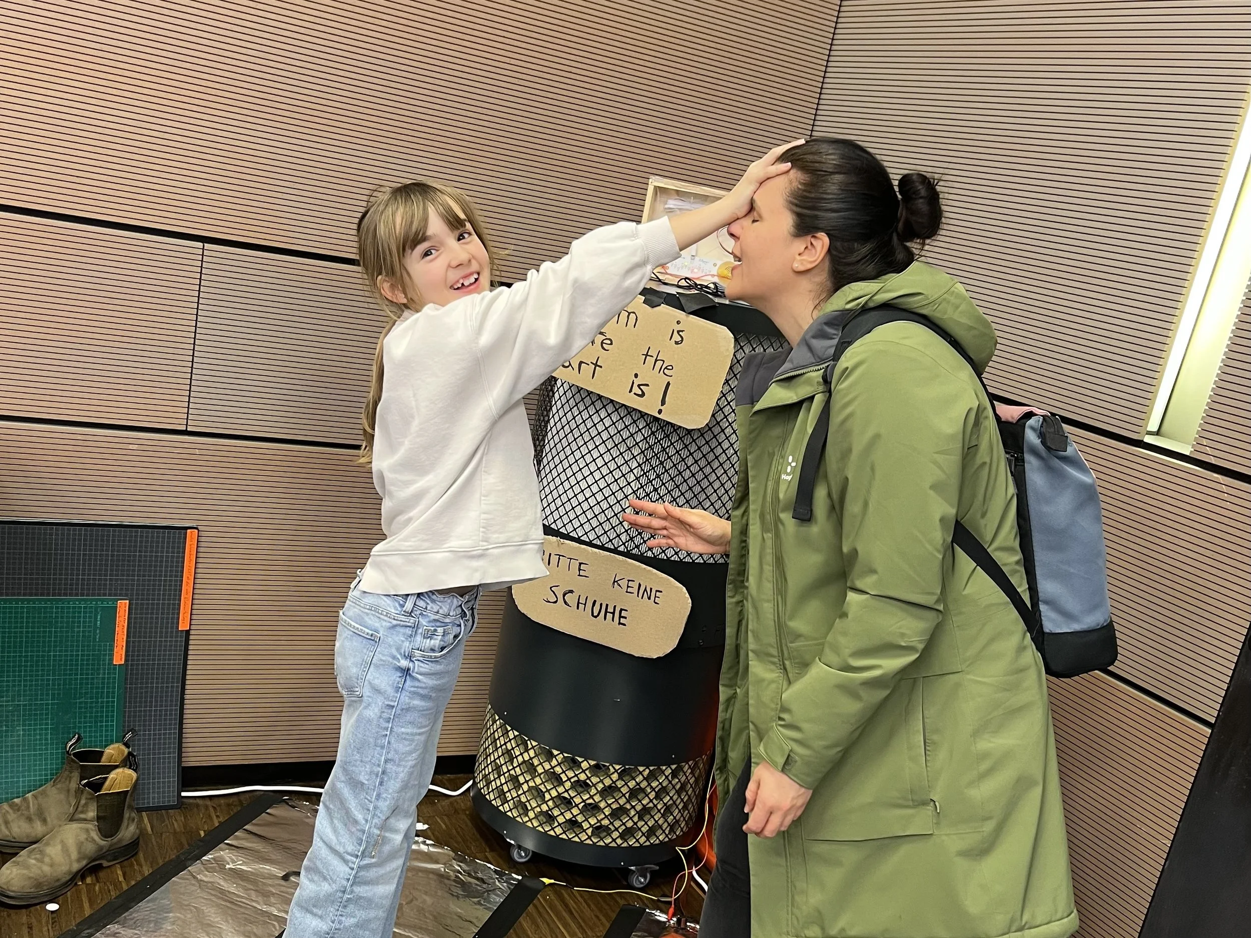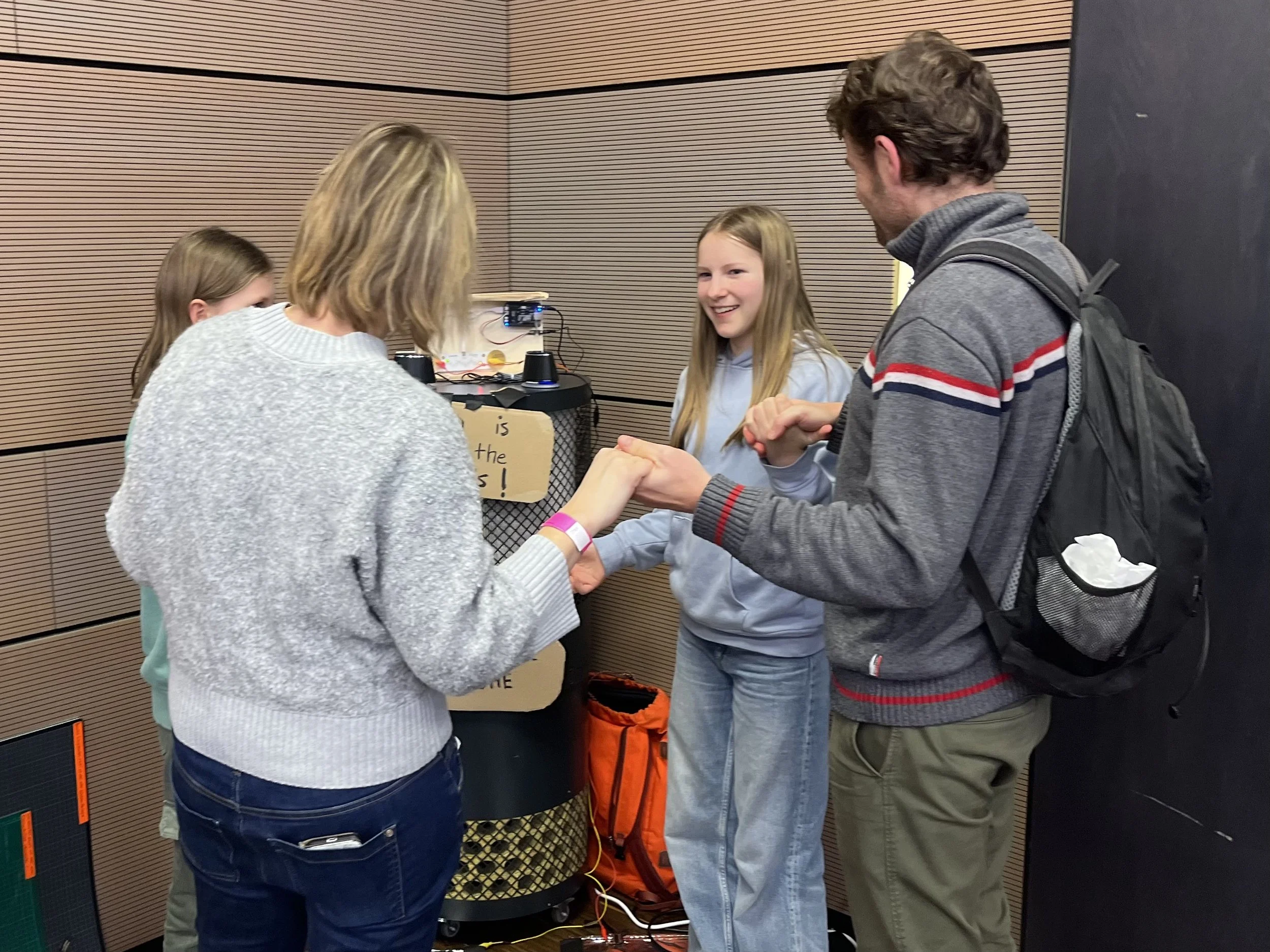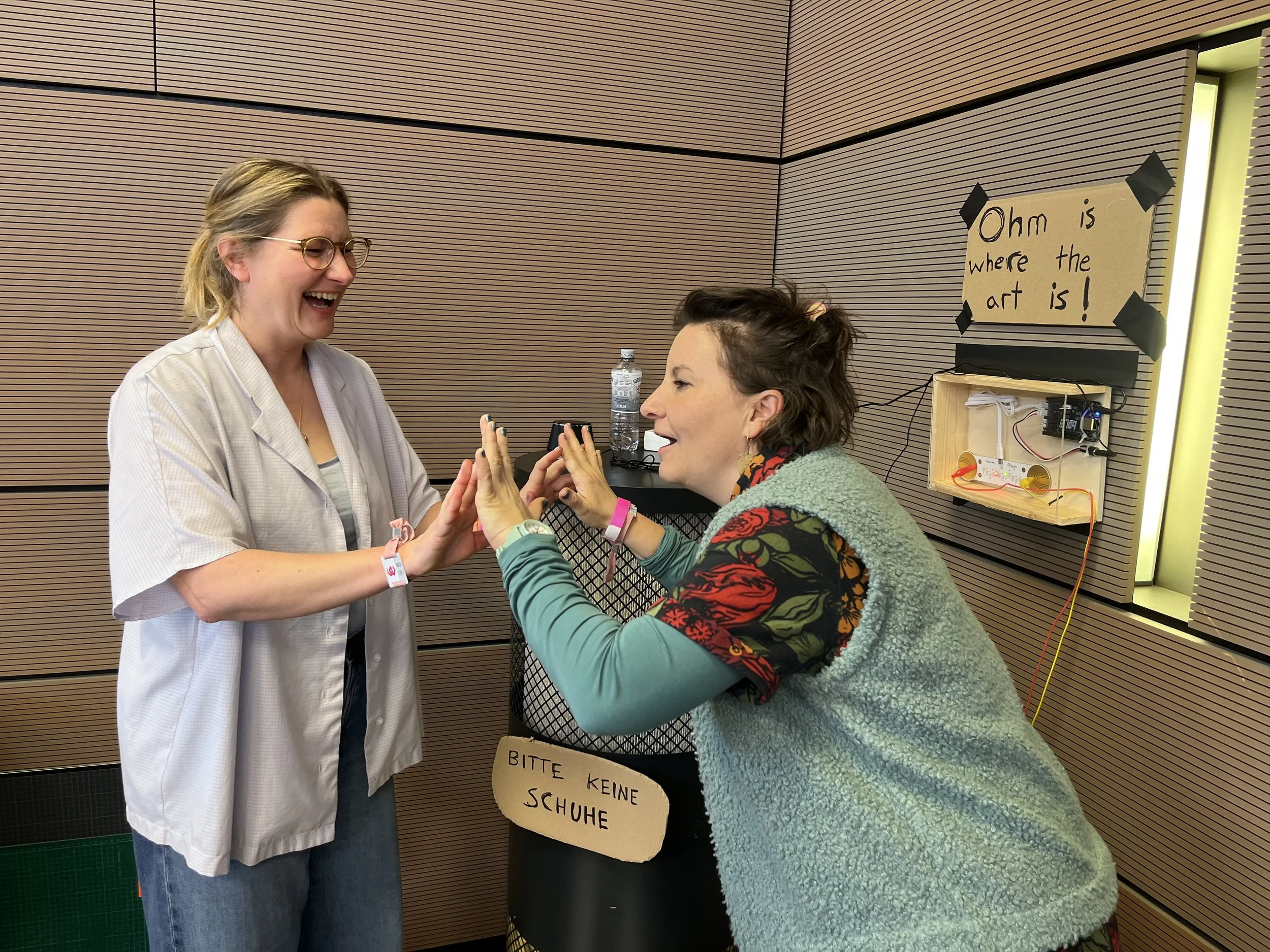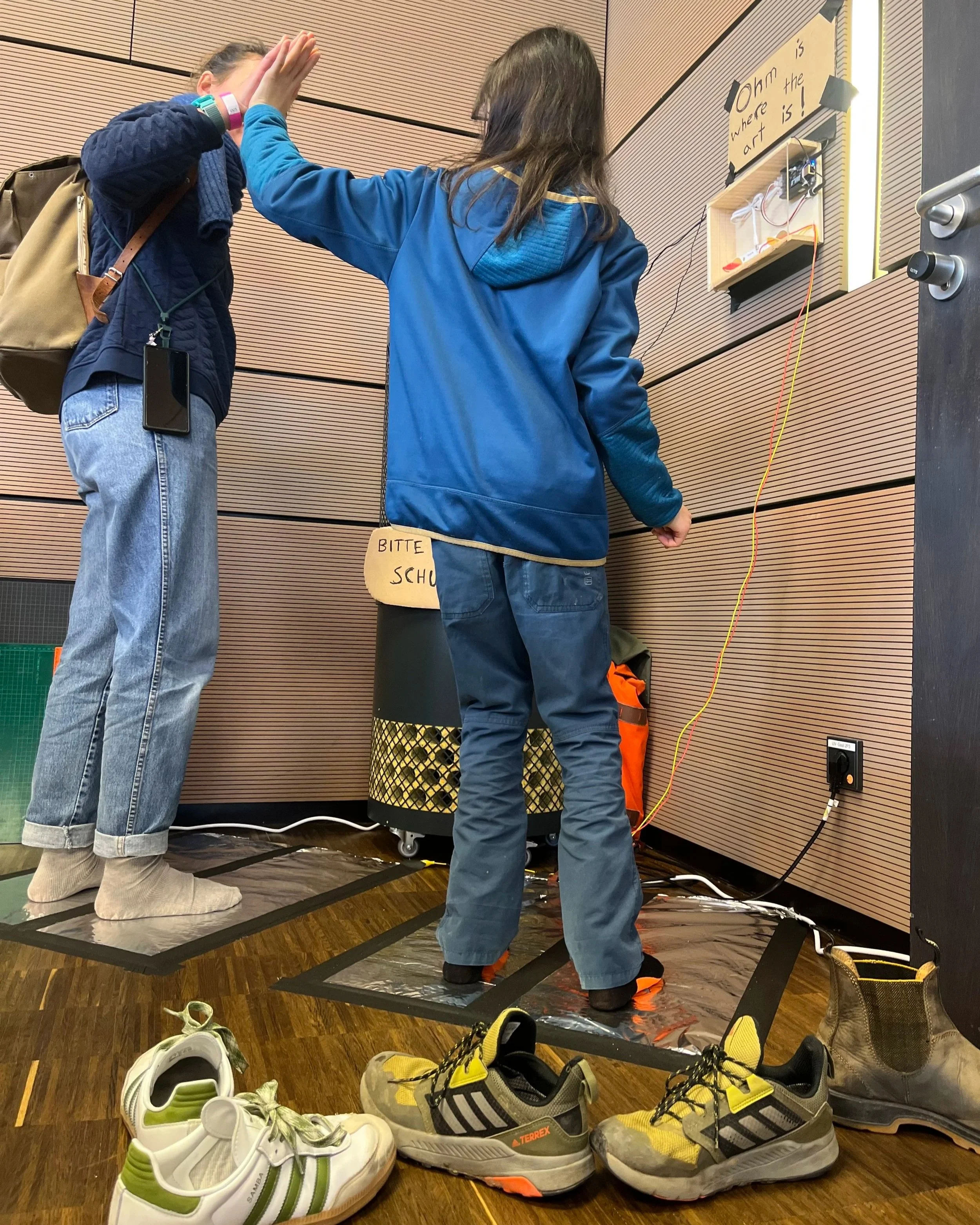 The interaction had two large pads (in this case heavy aluminum foil over heating insulation) that attach to either side of the Playtronica TOUCHME board. When people stand on each pad and touch hands, play footsie, give high fives, kiss or make human chains, the device produces musical notes that change based on the amount of electricity that makes it back into the system through people’s bodies.