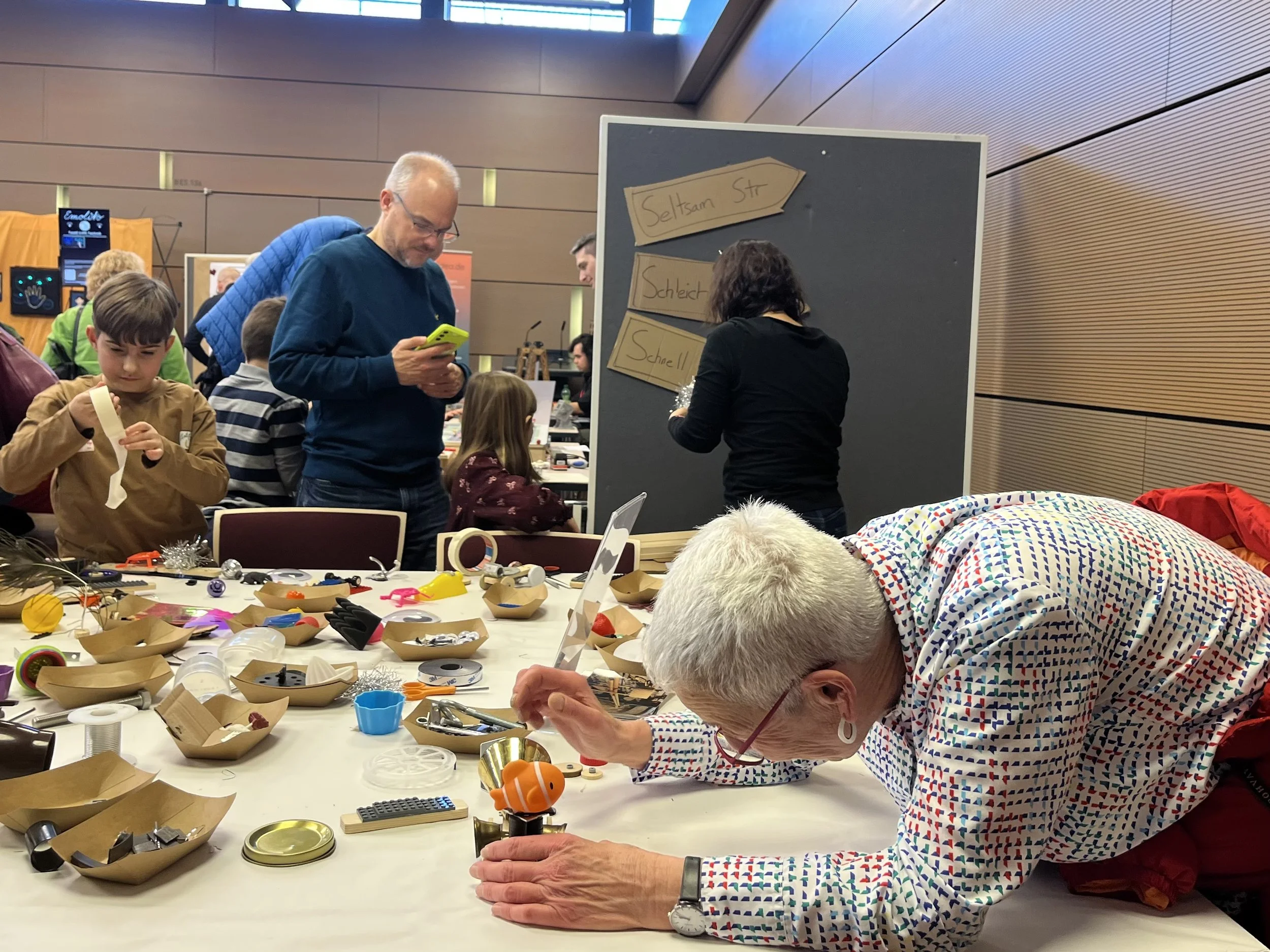 As people came to the station I offered the theme of building a car that is schnell (fast), schleich (slow or creeping) or seltsam (strange). Many playful designs resulted from this provocation and learners got inspired by one or more of these goals.