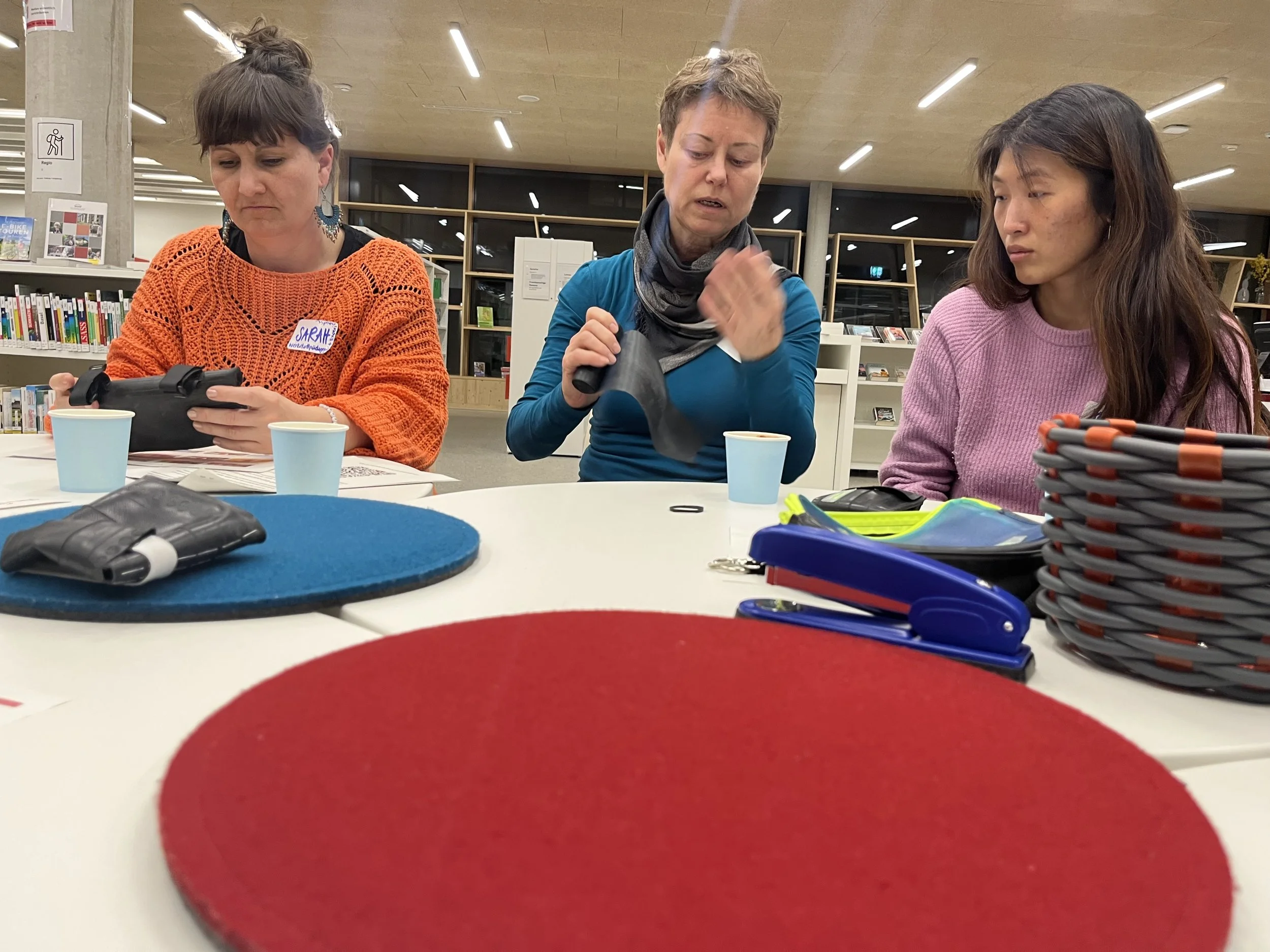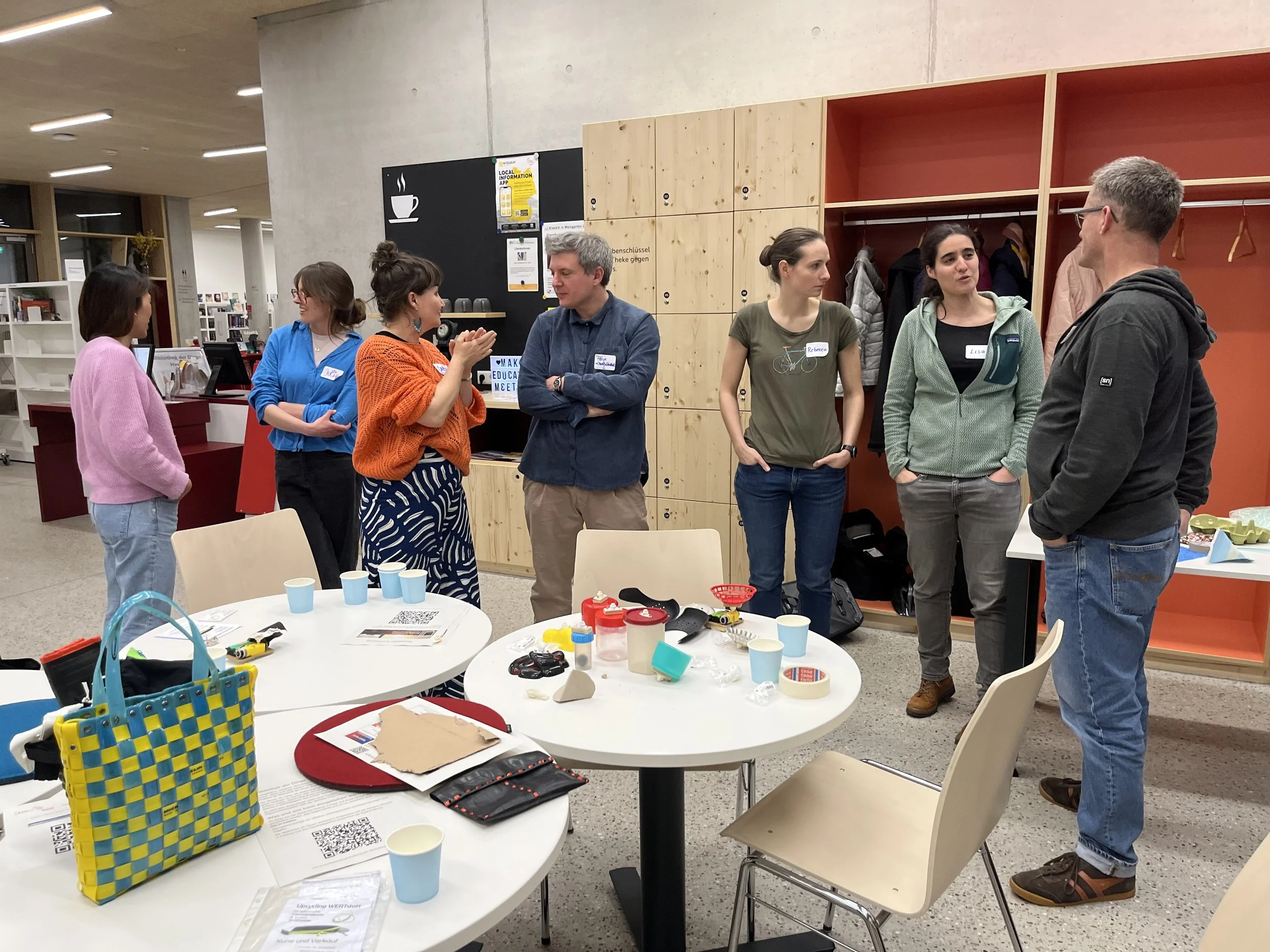 Each session we’re planning to have a different theme and convene at a different location around the city. For our March meet-up we got together at the new Haslach neighborhood branch of the city library (stadtbibliothek) with the theme of recycling. We had about a dozen participants from schools, libraries, museums, the local university and afterschool programs. Local maker and entrepreneur Barbara Ibo of the Upcyling WERTstatt here in Freiburg.